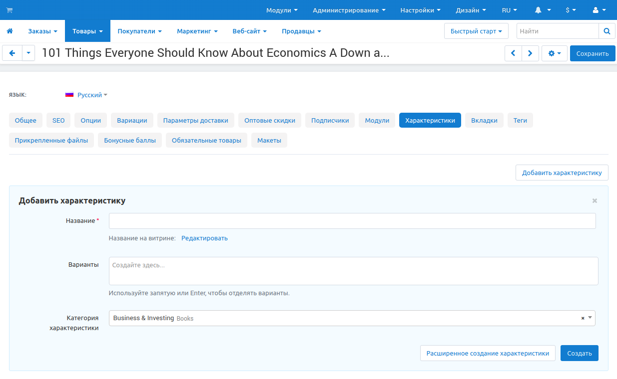 Нажмите на кнопку Расширенного создания характеристики, чтобы перейти от создания характеристики на странице товара к ее созданию со списка характеристик.