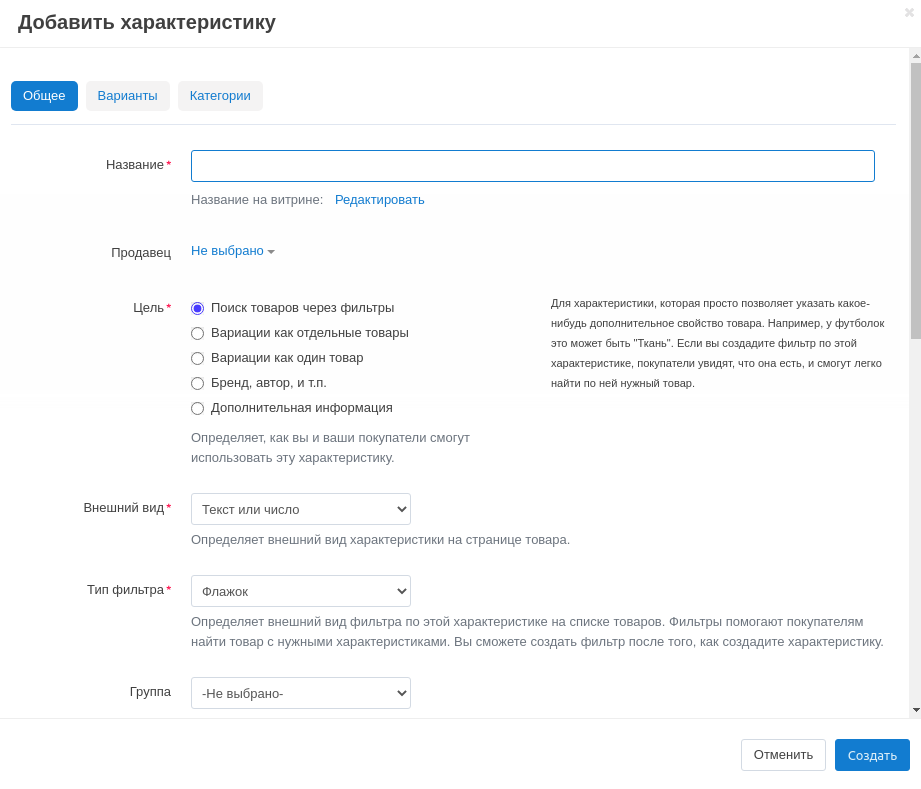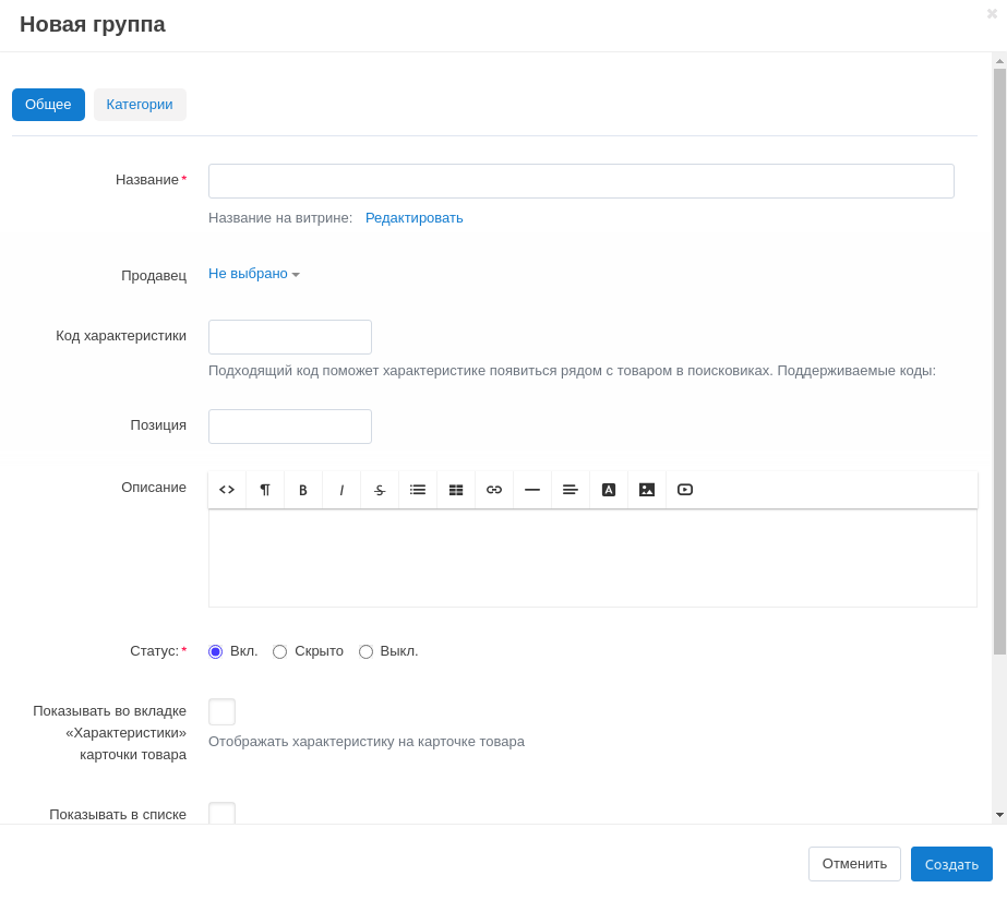 - Описание — описание группы, которое отобразится на витрине, если покупатель нажмет на знак вопроса рядом с названием характеристики на вкладке “Характеристики”.