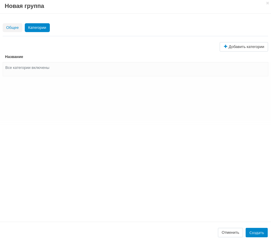 Если характеристика доступна в категории, она также доступна в подкатегориях. Если характеристика относится к группе, то она доступна во всех категориях, где доступна группа. Вкладка Категории в этом случае не будет отображаться.