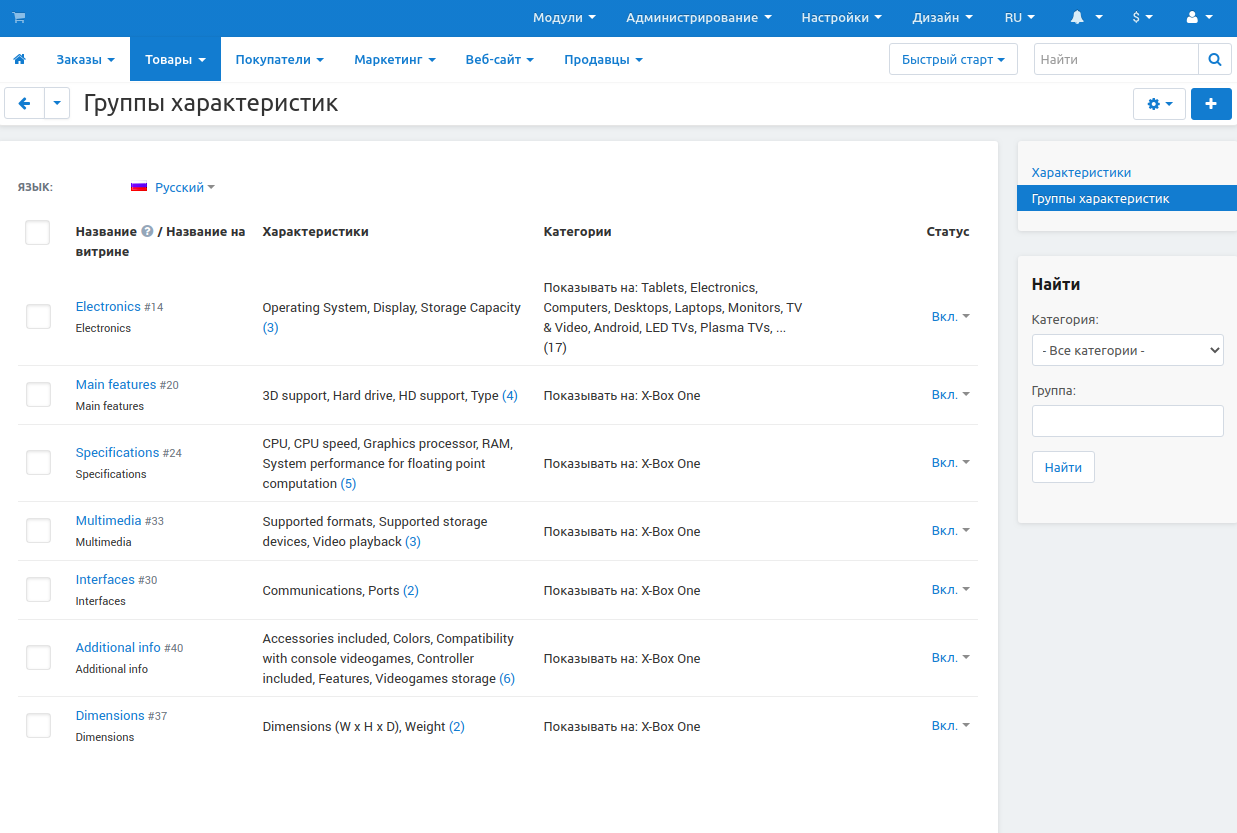 Нажмите кнопку Создать. Новая группа характеристик появится на странице Товары → Характеристики, если вы выберете Группы характеристик в меню справа.