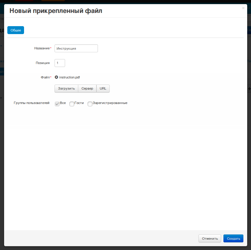Вкладка Прикрепленные файлы появится, только если на странице Модули → Управление модулями включен модуль Прикрепленные файлы.