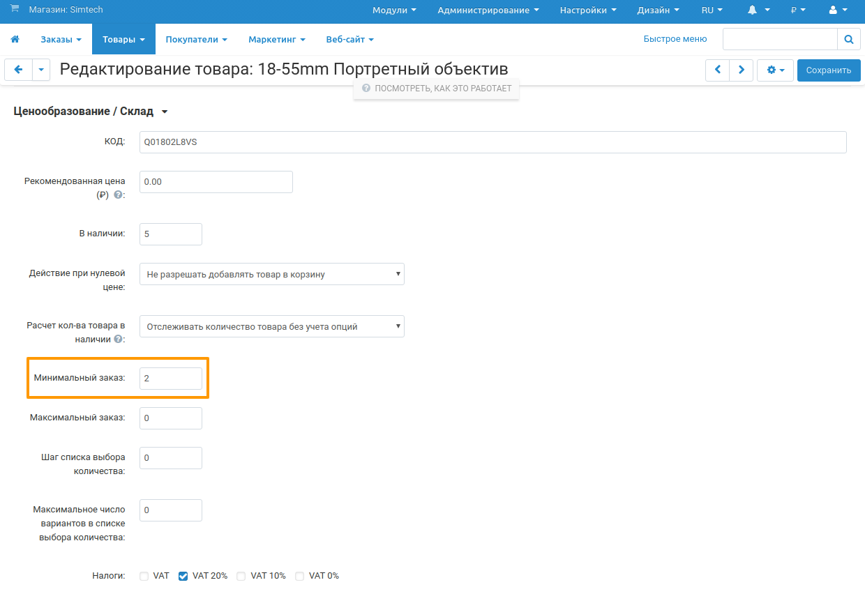 3. Введите нужное количество экземпляров товара в поле Минимальный заказ из раздела Ценообразование/Склад.
