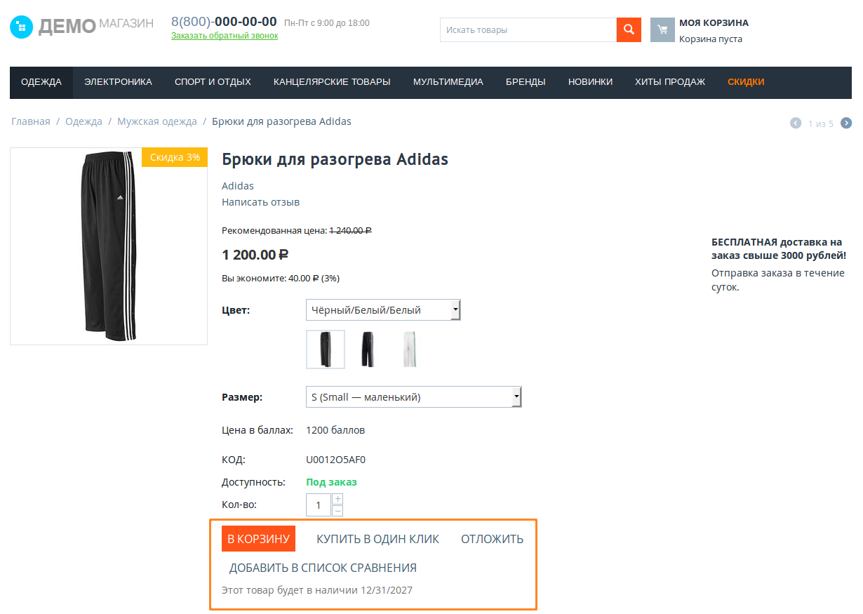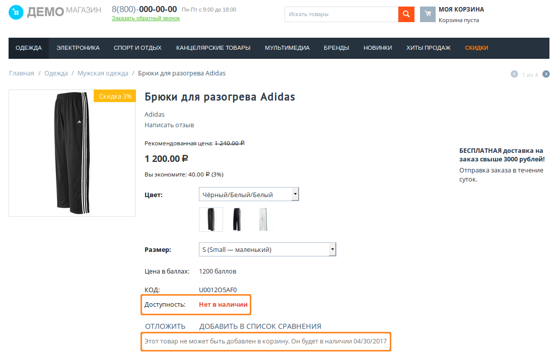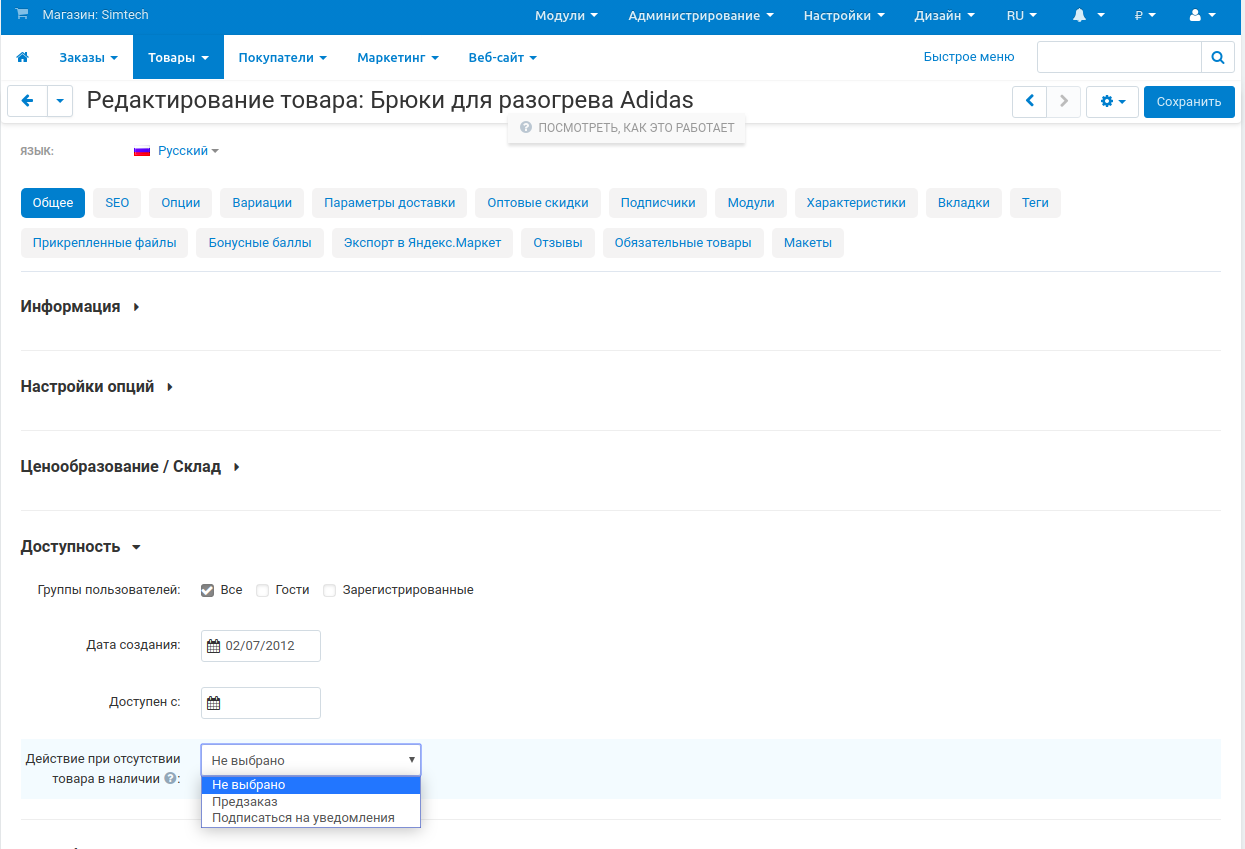 • Предзаказ — покупатель сможет купить товар заранее, независимо от того, сколько экземпляров товара сейчас в наличии и указана ли дата доступности товара.