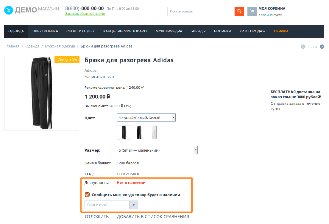 • Подписаться на уведомления — покупатель сможет подписаться на уведомление о том, что товар появился в наличии; это уведомление придёт по электронной почте.