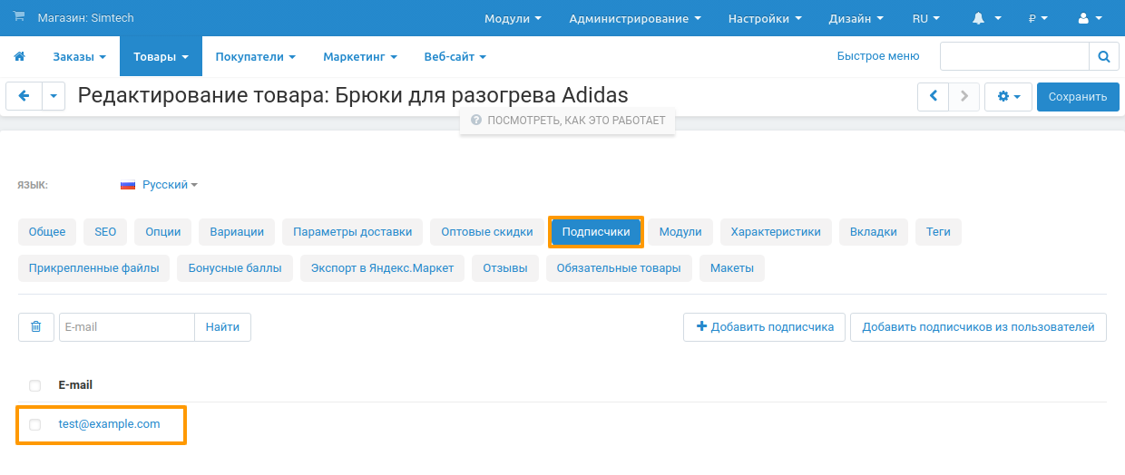 • Чтобы увидеть подписчиков на конкретный товар, откройте страницу Товары → Товары, нажмите на название нужного товара и перейдите на вкладку Подписчики.