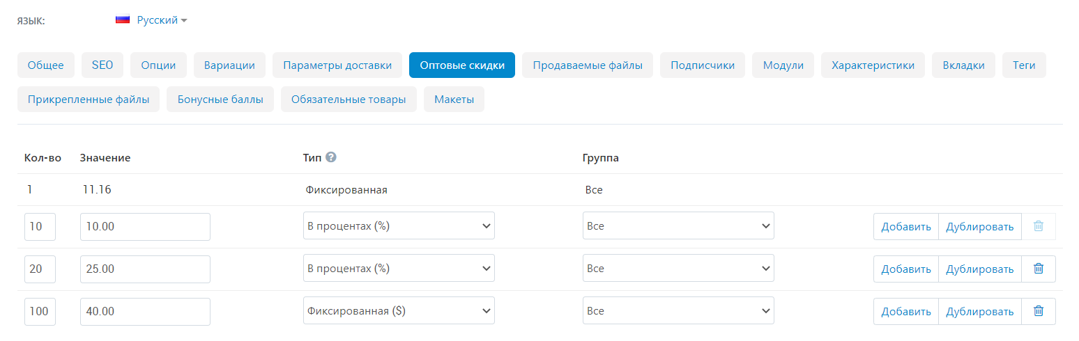 На этой вкладке задаются оптовые скидки на товар в зависимости от количества штук в корзине. Покупатели увидят эти скидки на странице товара на витрине.