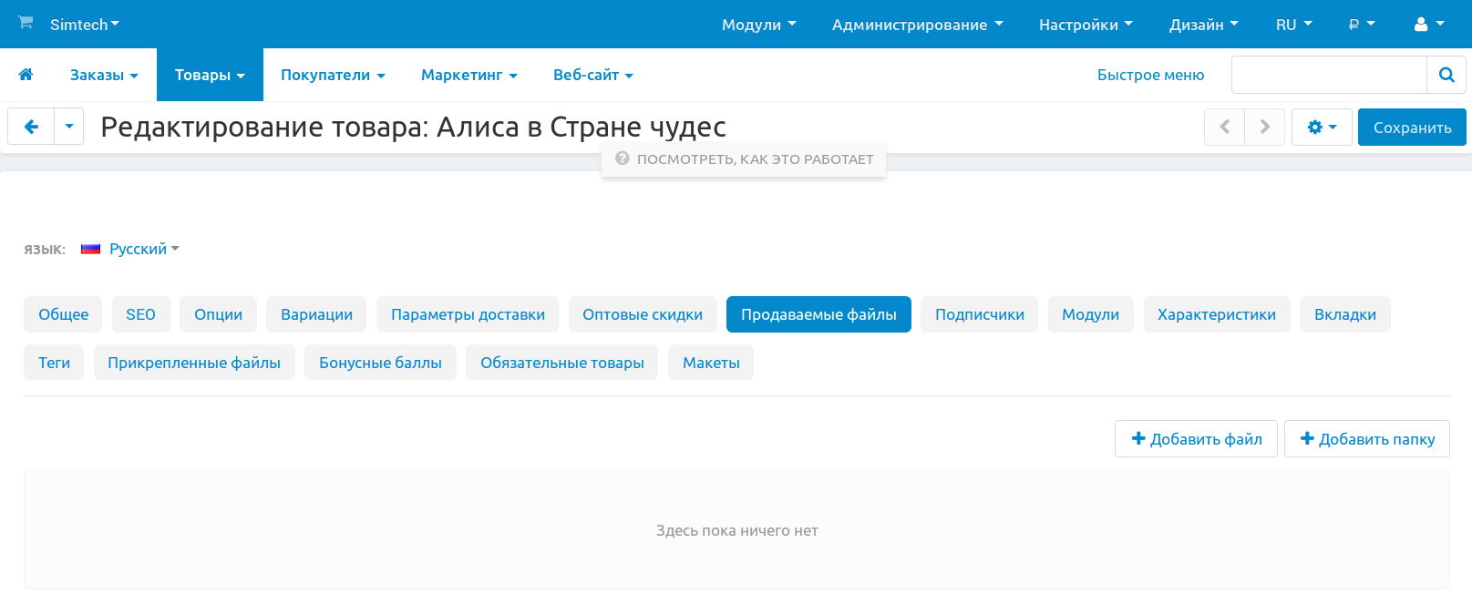 Для цифровых инструкций и/или файлов, которые идут с товаром, но не продаются, рекомендуем использовать другую вкладку — Прикреплённые файлы.