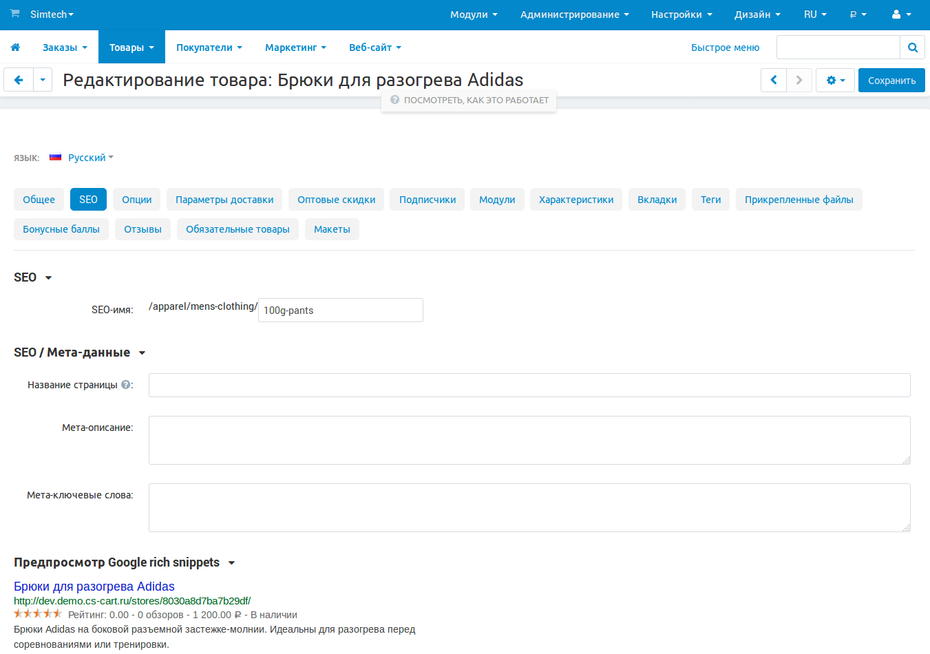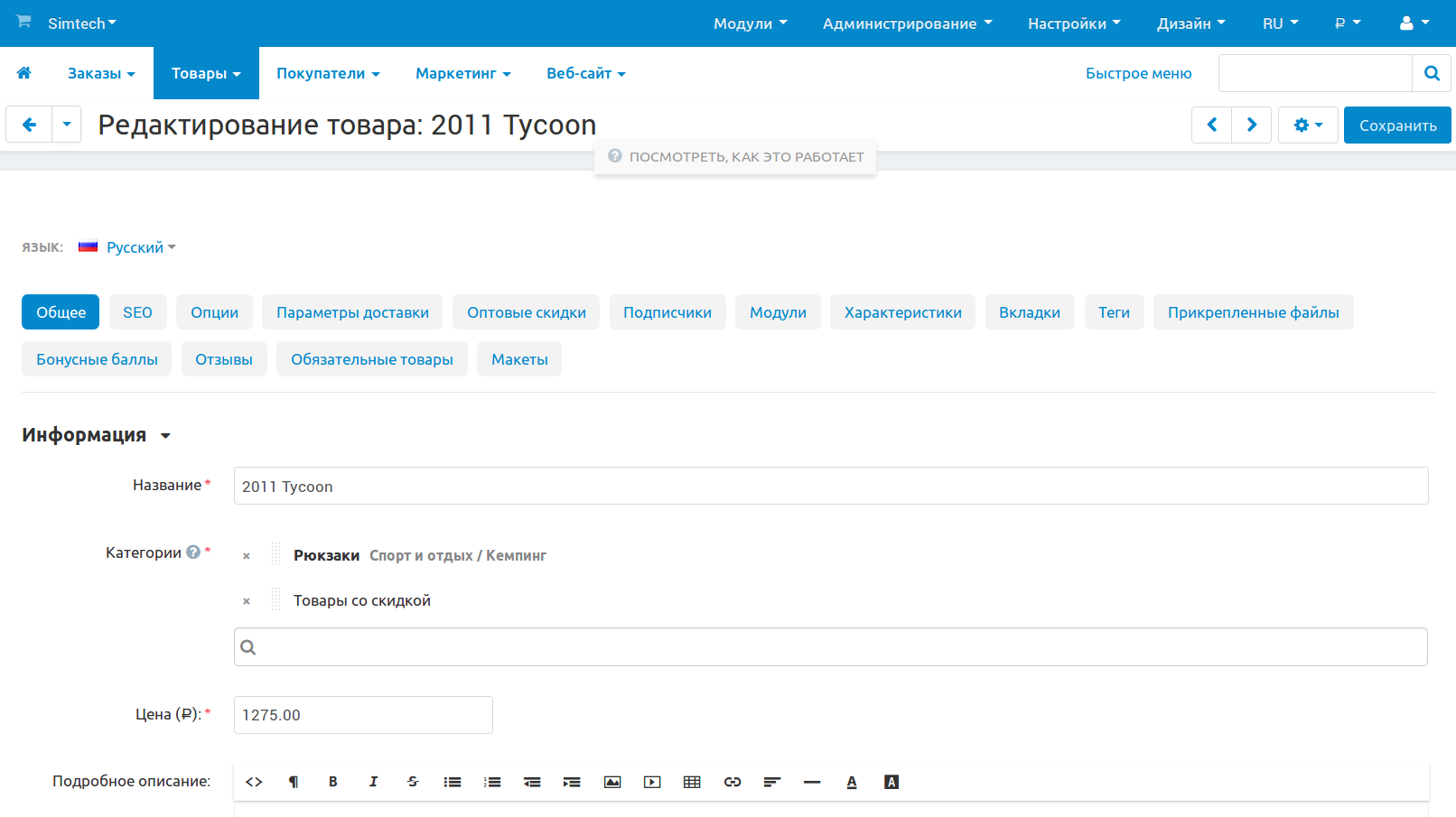 При создании или редактировании товара можно указать много разных свойств. Для удобства они распределены по вкладкам на странице редактирования товара.