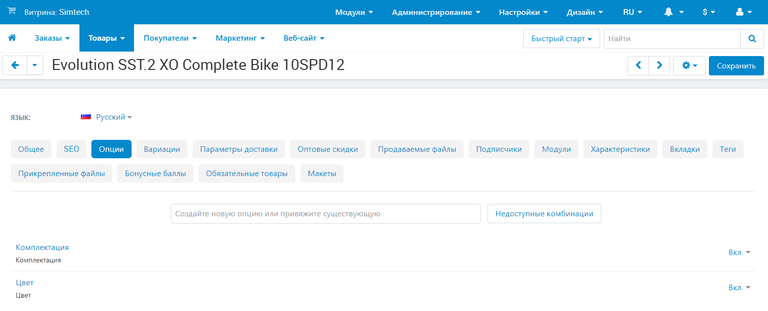 Эта вкладка появляется, если включен модуль “Комбинации товаров”.