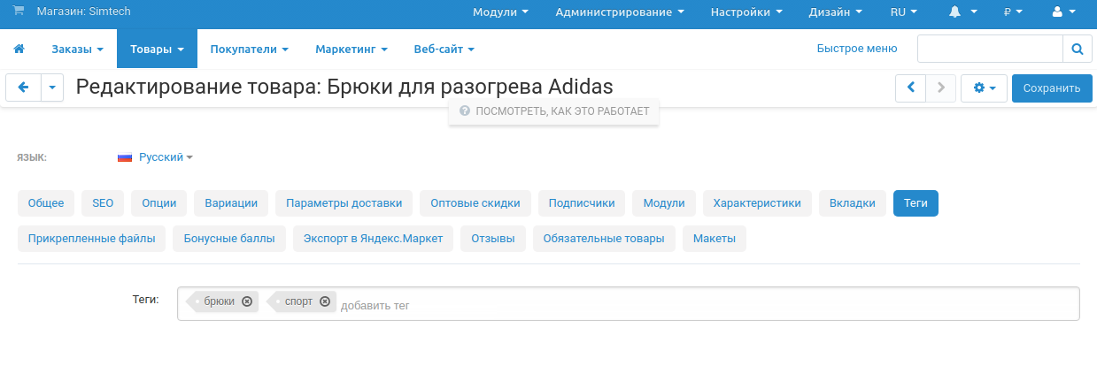 На этой вкладке находится список тегов, связанный с товаром. Теги появляются на витрине в блоке Теги.