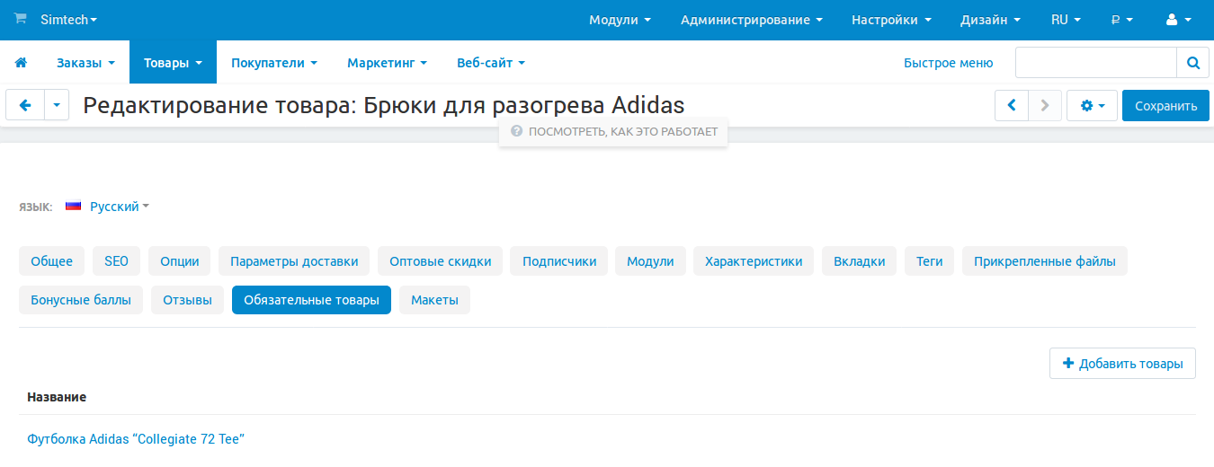 На этой вкладке находится список товаров, которые обязательно будут добавлены в корзину вместе с этим товаром. Нажмите кнопку Добавить товары, чтобы выбрать обязательные товары.