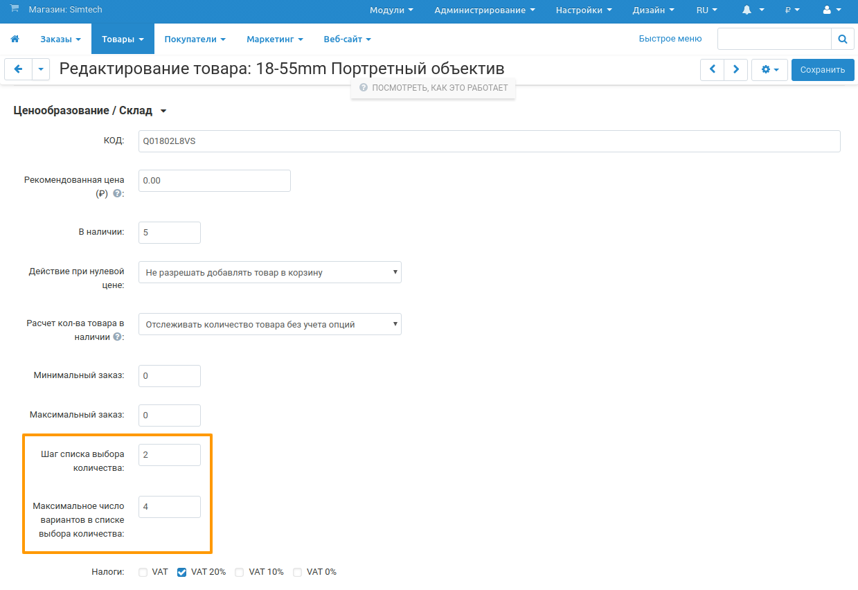 Например, если Шаг списка выбора количества равен 2, то покупатель сможет выбрать только 2, 4, 6, 8, 10, и т.д. экземпляров товара в выпадающем списке. Если в наличии имеется только 5 экземпляров, то в выпадающем списке будут варианты 2 и 4.