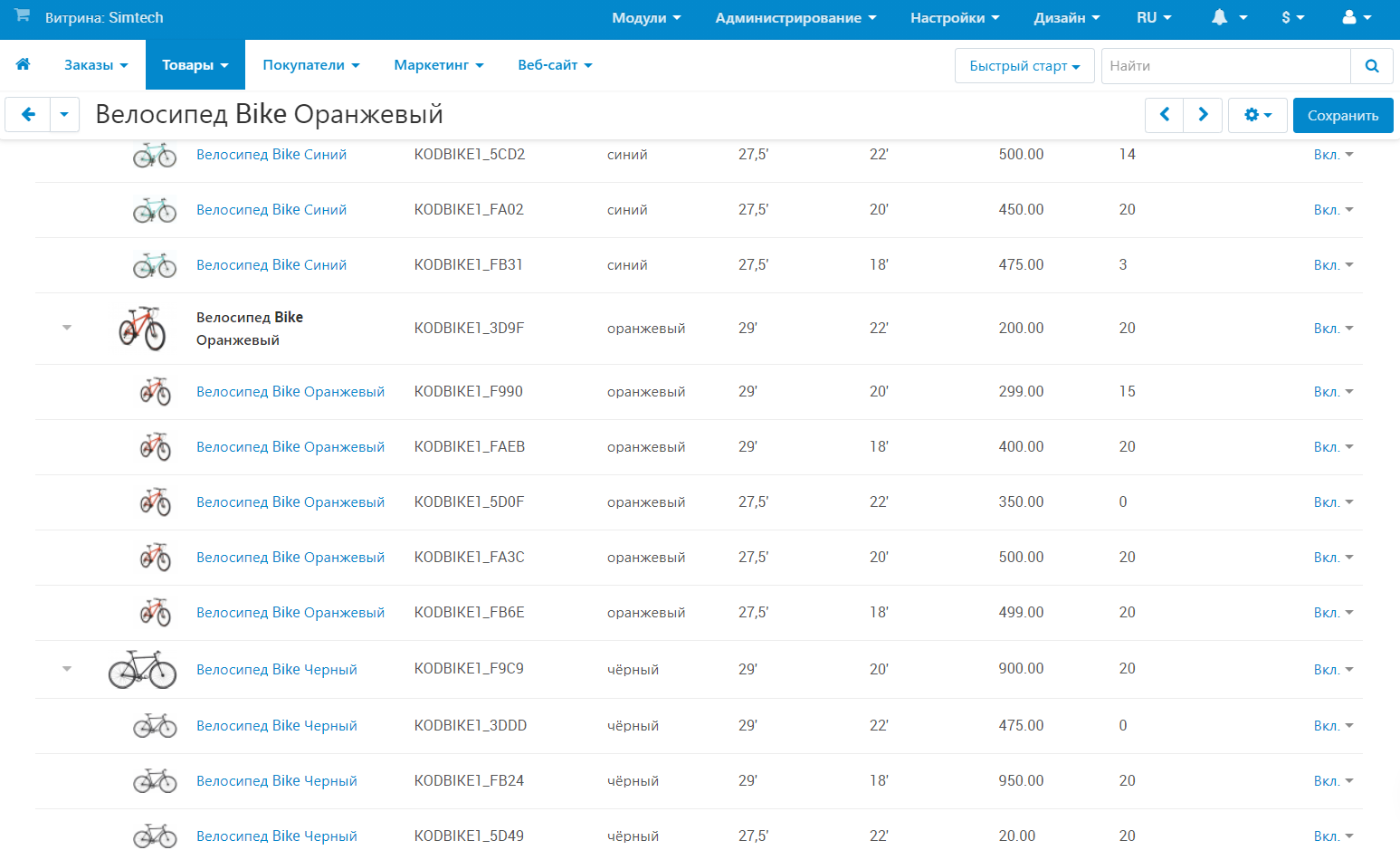 Когда эталонный товар и его характеристики созданы, то остальные сочетания характеристик (вариации) можно создать автоматически. Создадим вариации для велосипеда: