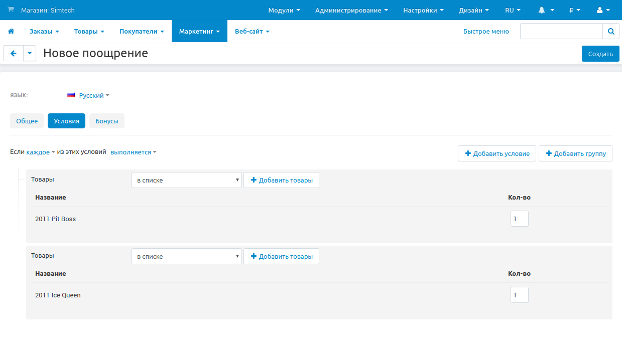 Выберите из выпадающего списка условие Товары. Затем выберите вариант в списке и нажмите кнопку Добавить товары.