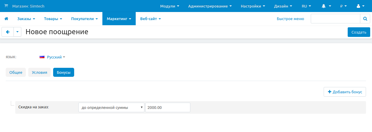 Выберите любой бонус из выпадающего списка и настройте его. Например, давайте выберем бонус Скидка на заказ с вариантом до определённой суммы и введем значение 2000. Тогда покупатель получит скидку на заказ и должен будет заплатить за все заказанные товары 2000 условных единиц в базовой валюте магазина, если только суммарная стоимость всех товаров и так не меньше 2000.