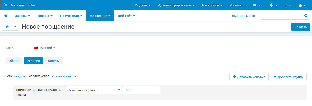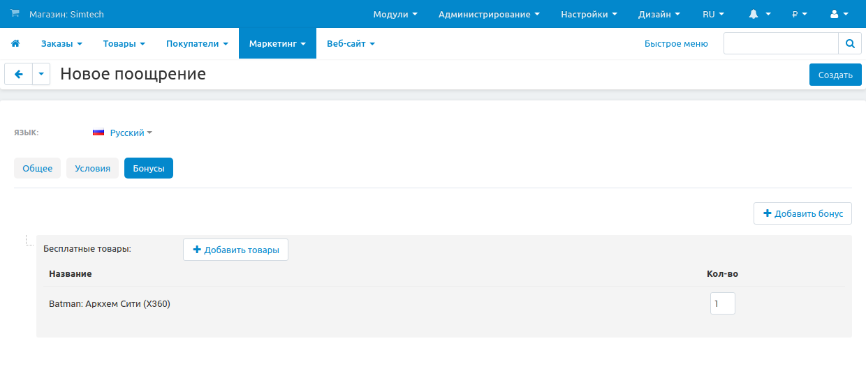 Нажмите кнопку Создать. Подарок добавится покупателю в корзину, когда будет выполнено условие промо-акции.