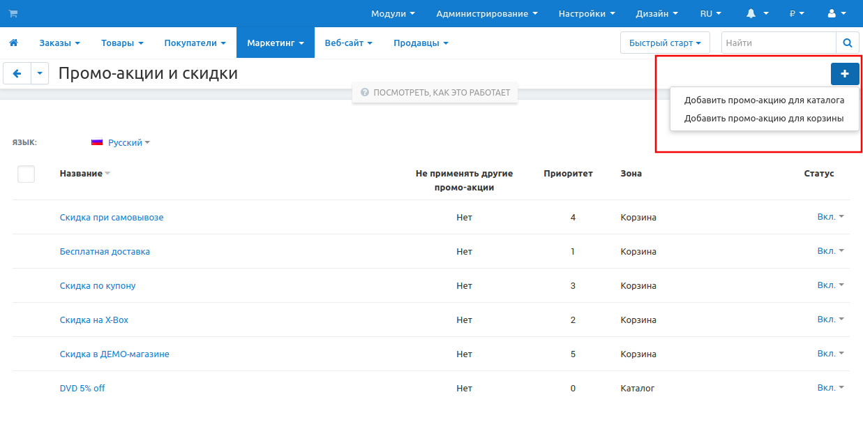 Нажмите кнопку + в правом верхнем углу и выберите вариант Добавить промо-акцию для корзины или Добавить промо-акцию для каталога: