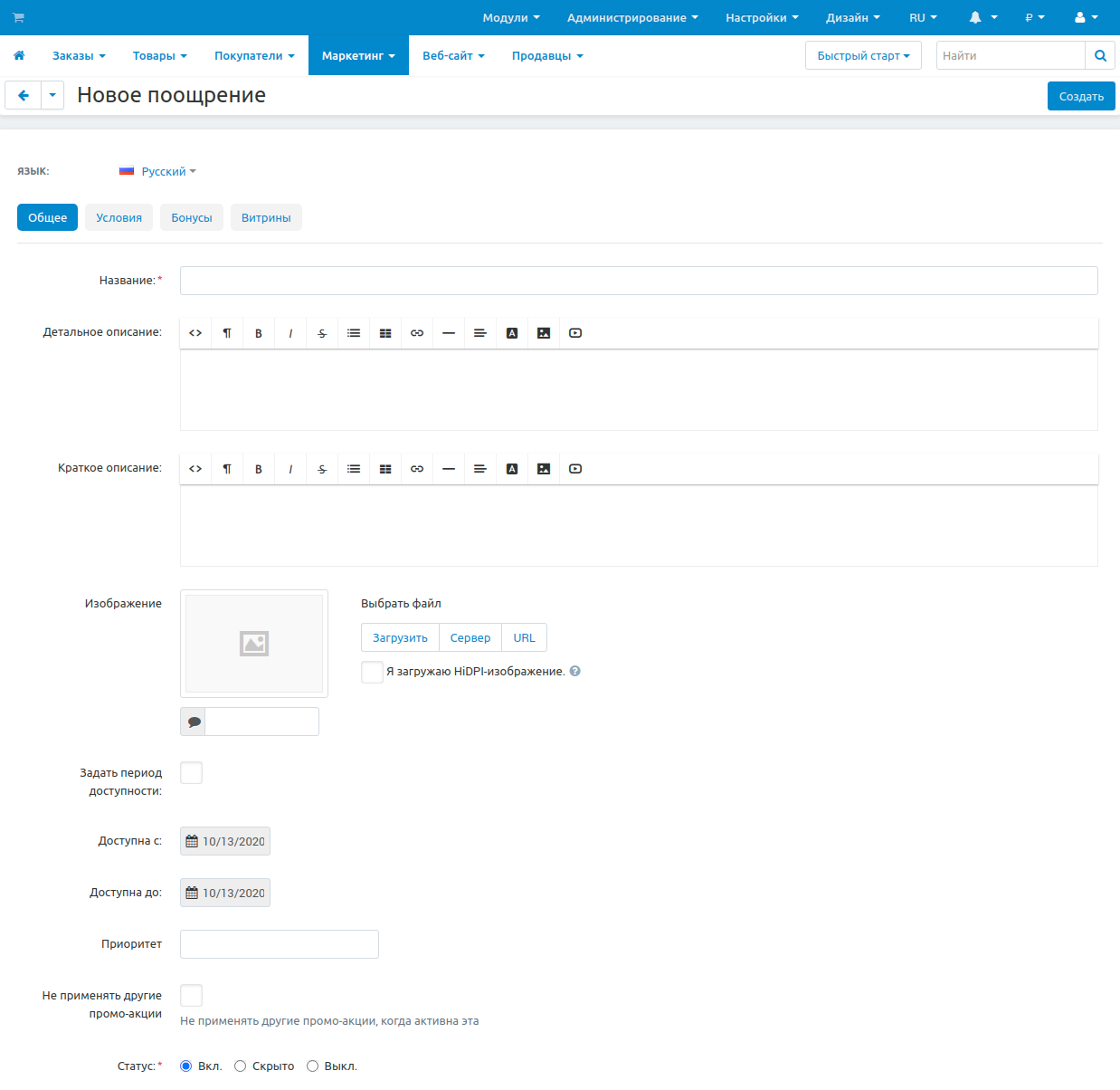 Откроется форма создания промо-акции. Введите необходимую информацию на вкладке Общее: