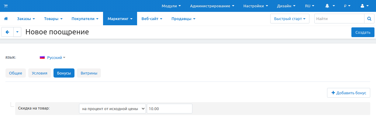 Перейдите на вкладку Бонусы. Она определяет, какие бонусы получит покупатель от этой промо-акции.