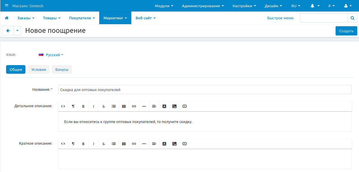 Откройте страницу Маркетинг → Промо-акции и скидки в панели администратора.