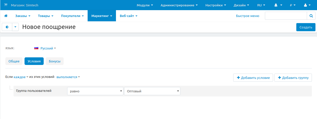 Выберите условие Группа пользователей с вариантом равно из выпадающего списка. Затем выберите группу ползьователей (например, на картинке внизу мы выбрали группу оптовых покупателей).