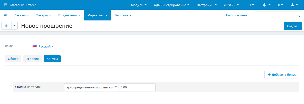 Перейдите на вкладку Бонусы и нажмите кнопку Добавить бонус.