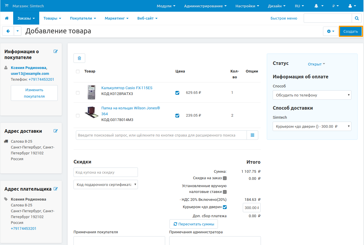 Вы попадёте на страницу создания заказа, но информация из скопированного заказа уже будет введена.