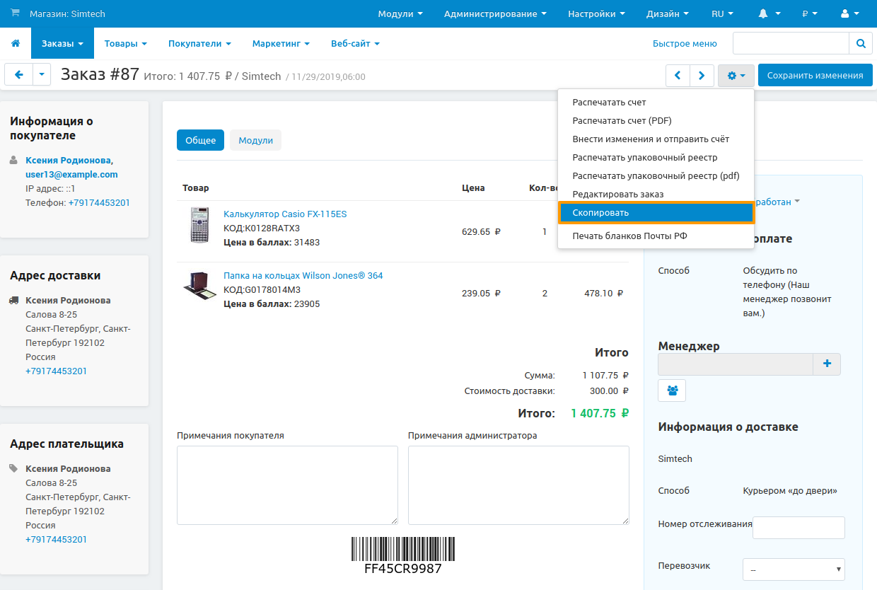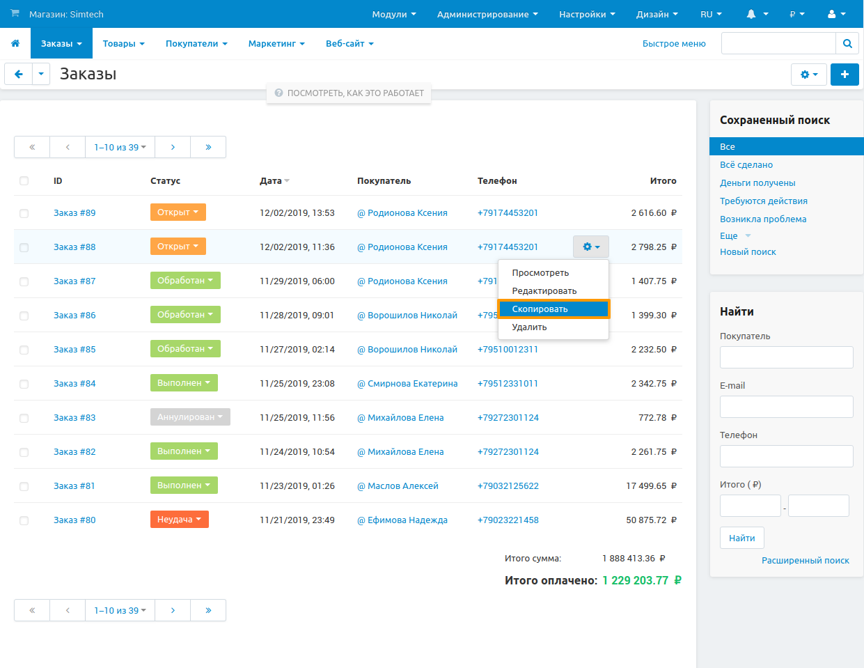 Вы можете копировать заказы, чтобы не вводить заново данные покупателя и не выбирать заказанные товары. Чтобы скопировать заказ: