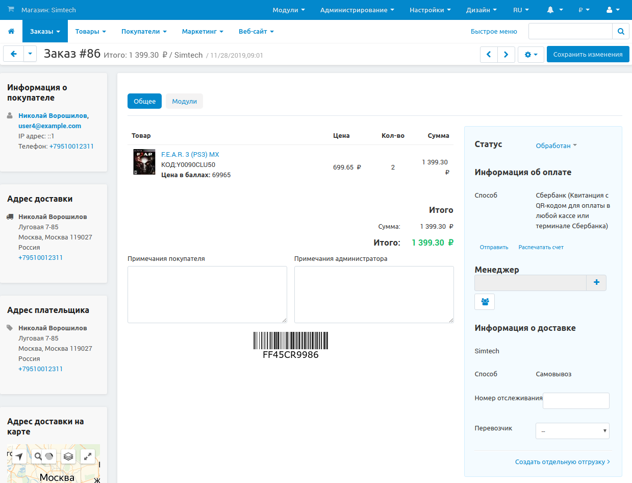 3. Откроется детальная страница заказа. Здесь вы можете добавлять комментарии, создавать отгрузки и назначать заказу менеджеров.