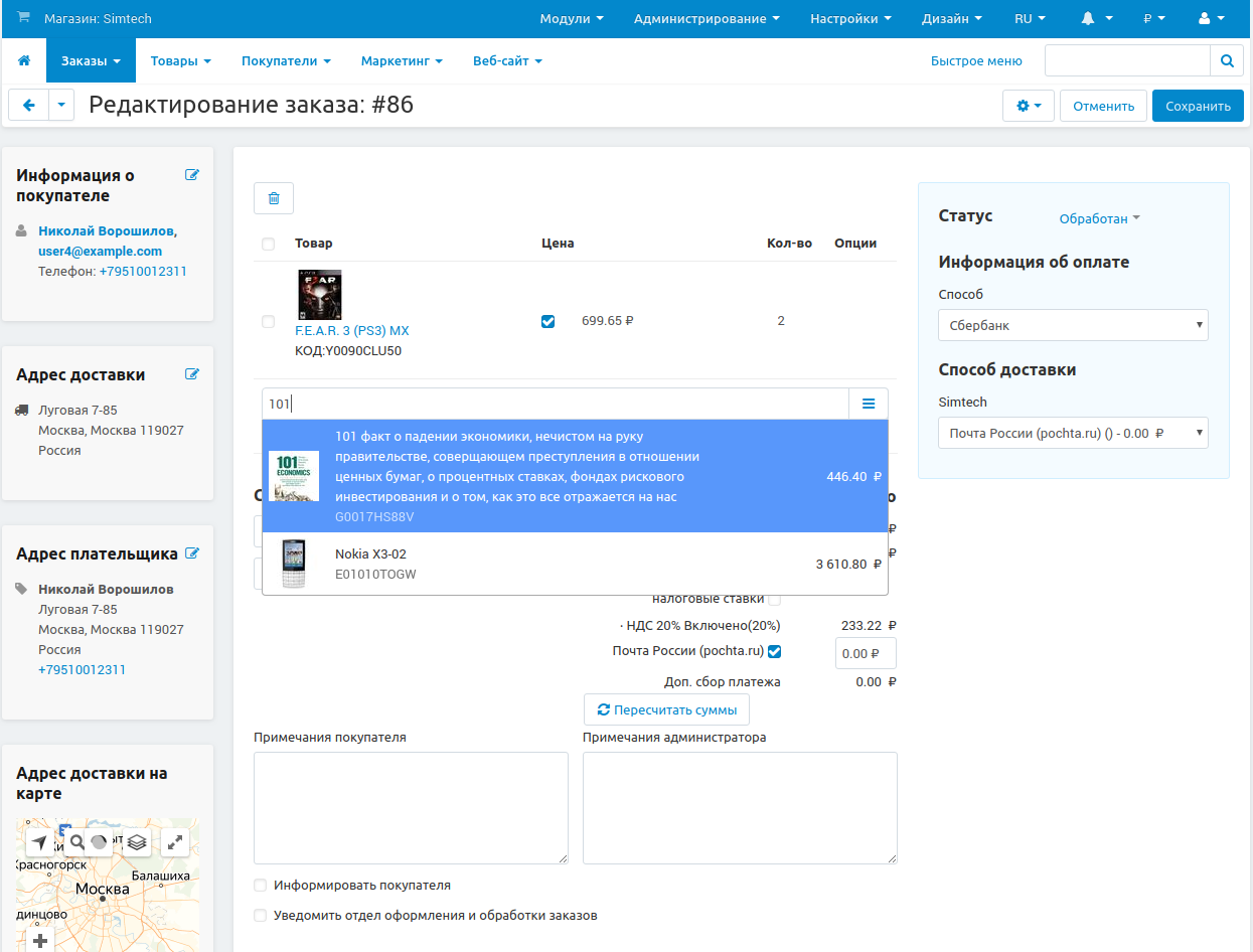 • Изменить цену товара в заказе: поставьте галочку Цена и измените цену. Цена товара изменится, но только в этом заказе. В каталоге цена останется неизменной.