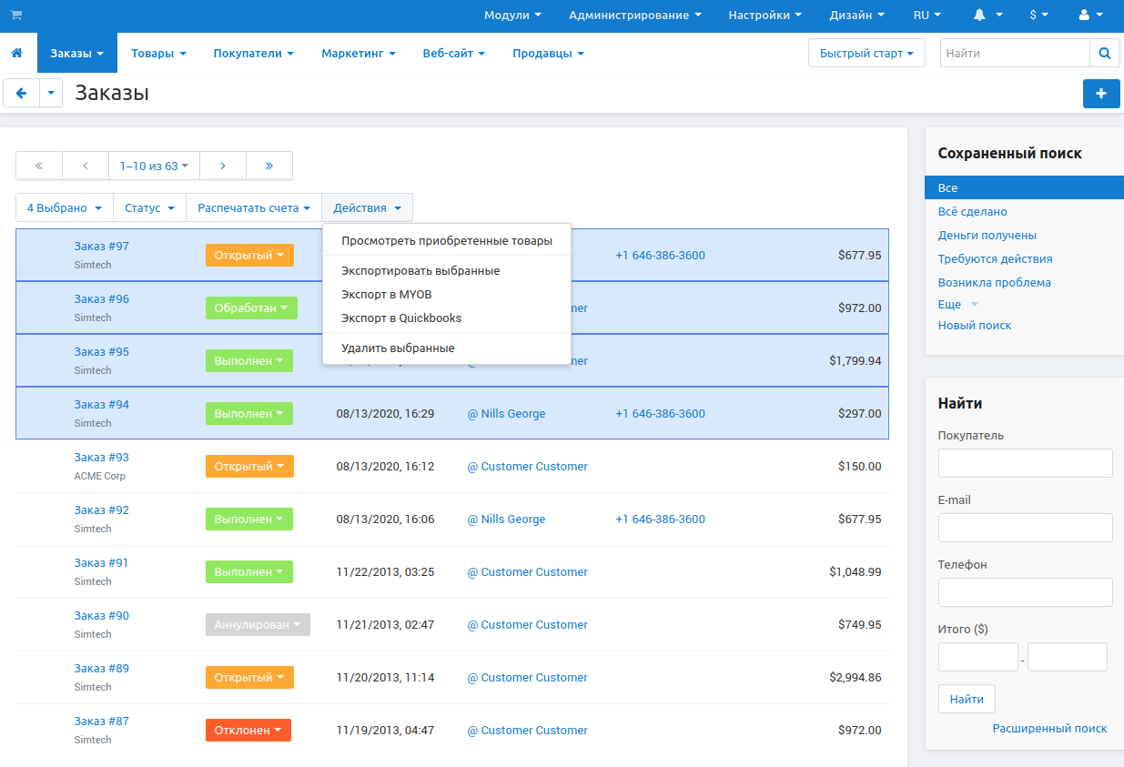 На странице Заказы → Все заказы можно выполнить много массовых действий над заказами, например, массово распечатать счета или экспортировать заказы.