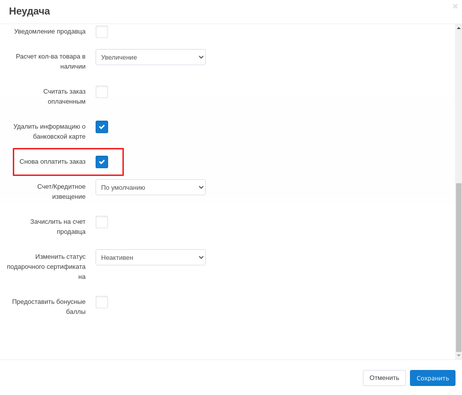 Если заказ находится в одном из статусов, для которого включена настройка Снова оплатить заказ, то покупатель сможет совершить повторную оплату на детальной странице этого заказа на витрине.