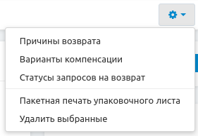 Раздел состоит из 4 подразделов: Запросы на возврат, Причины возврата, Варианты компенсации и Статусы запросов на возврат. Чтобы переключаться между подразделами, используйте кнопку с изображением шестерёнки.