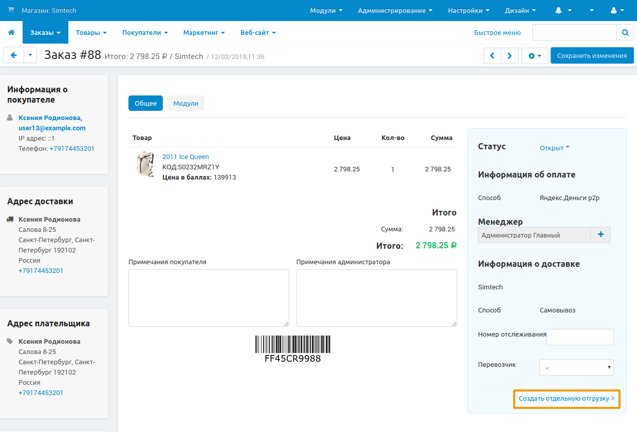 Нажмите Создать отдельную отгрузку.