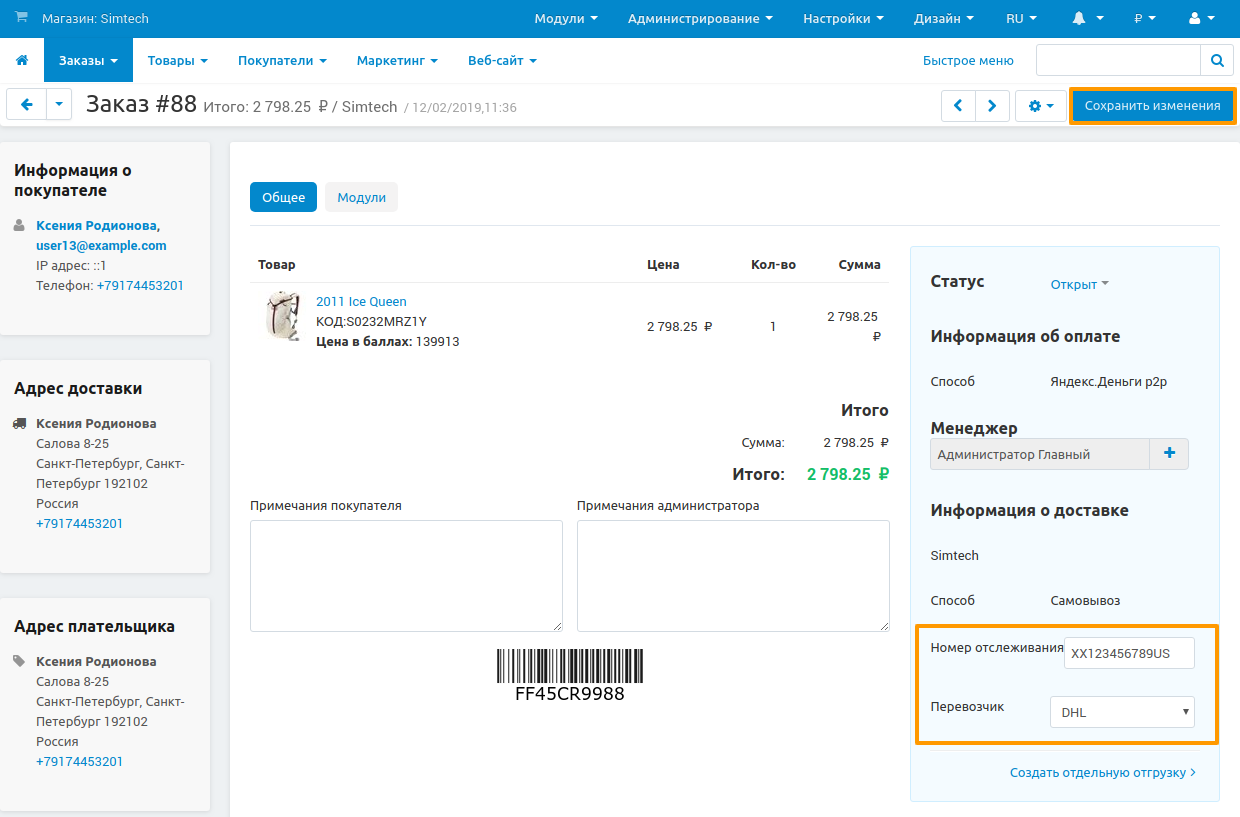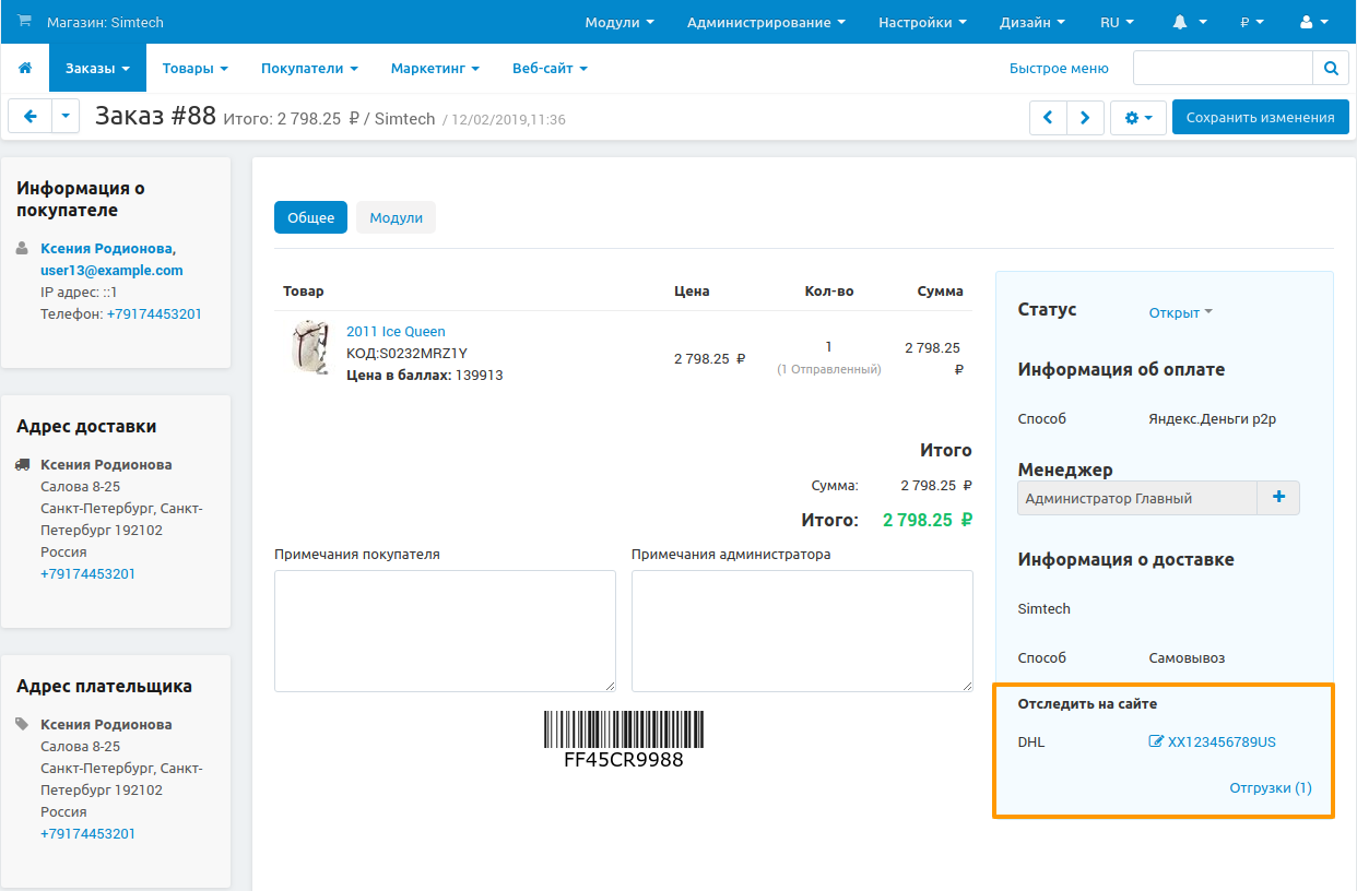 Номера отслеживания, которые вы введёте, появятся в разделе Информация о доставке. Если вы выберите перевозчика, то номера отслеживания будут ссылками, ведущими на страницу отслеживания на сайте перевозчика.