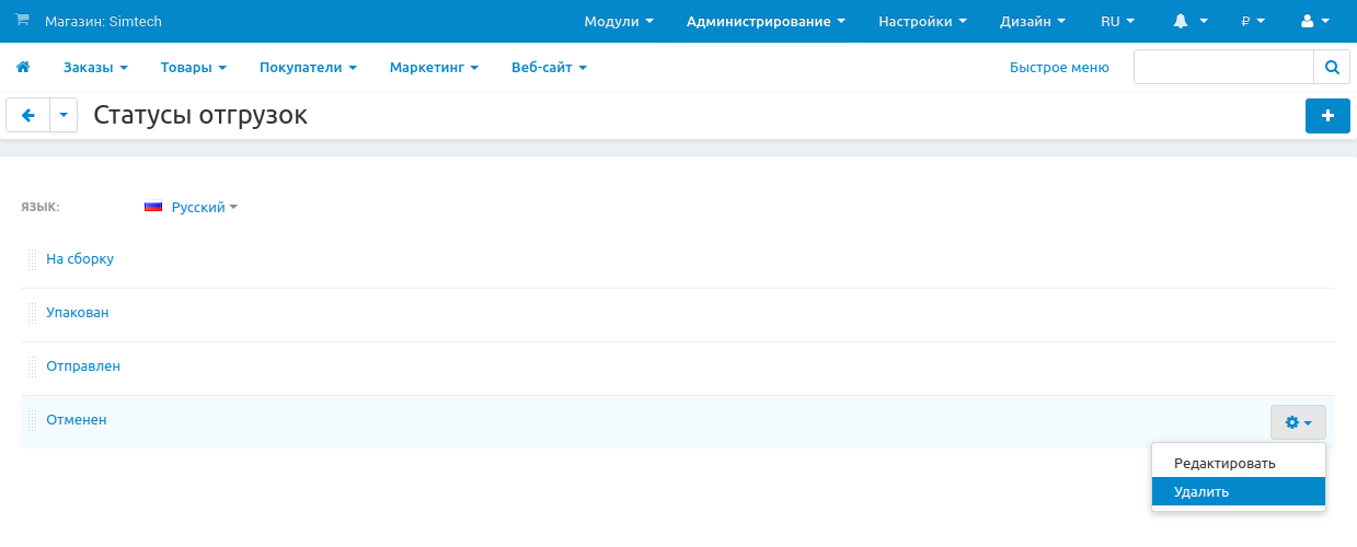 Откройте страницу Администрирование → Статусы → Статусы отгрузок.