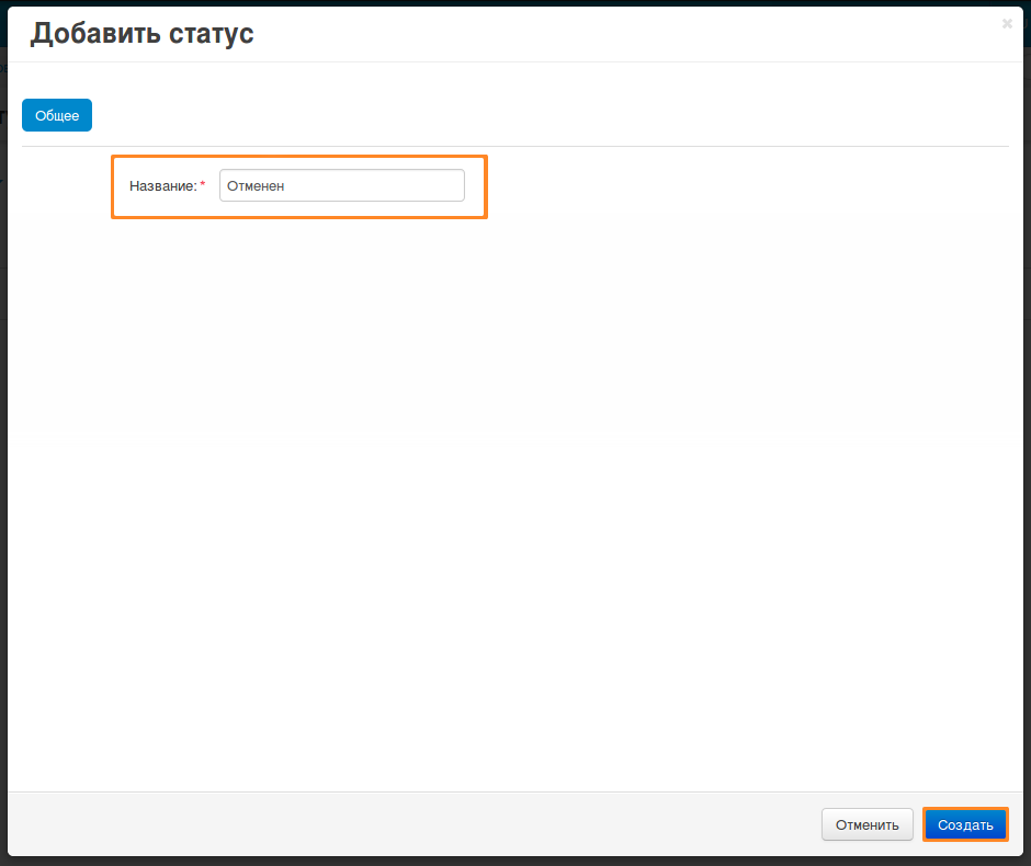 Назовите новый статус и нажмите кнопку Создать. После этого вы сможете выбрать этот статус на списке отгрузок.
