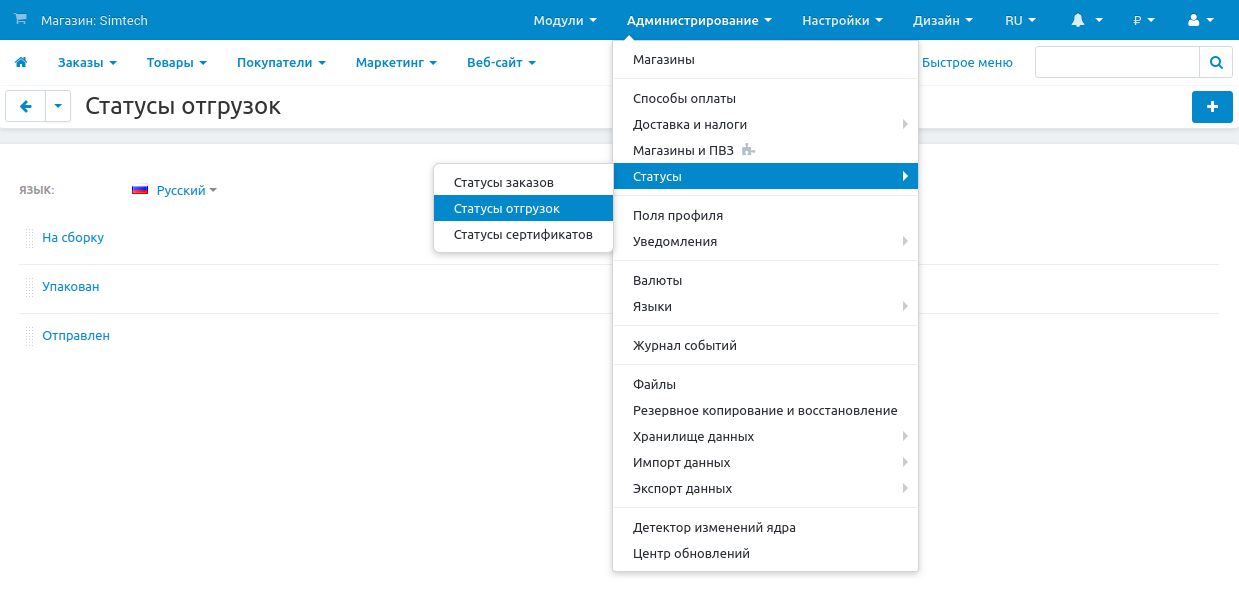 Откройте страницу Администрирование → Доставка и налоги → Статусы отгрузок.