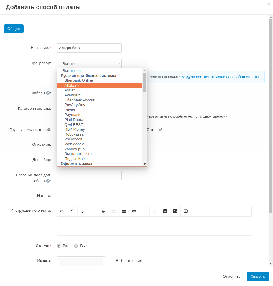 Выберите процессор оплаты “Alfabank” в окне редактирования способа оплаты.