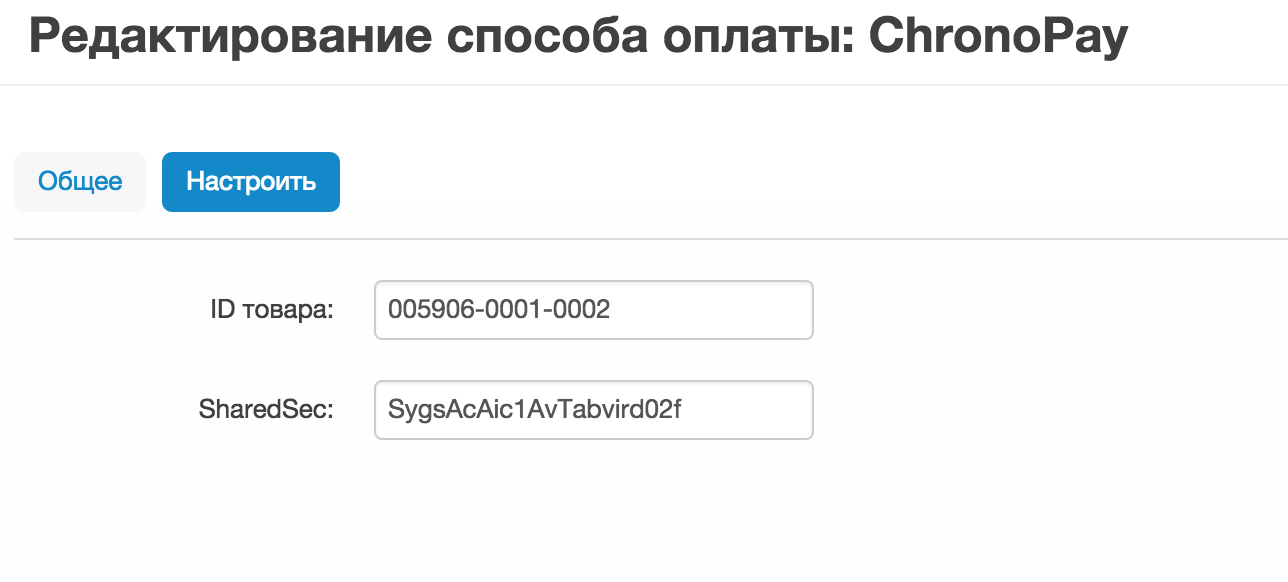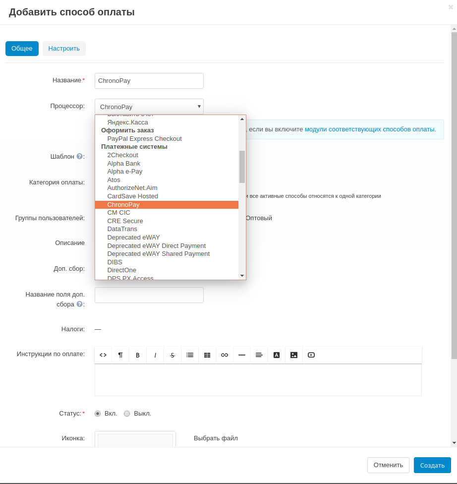 Выберите процессор оплаты “ChronoPay” в окне редактирования способа оплаты.