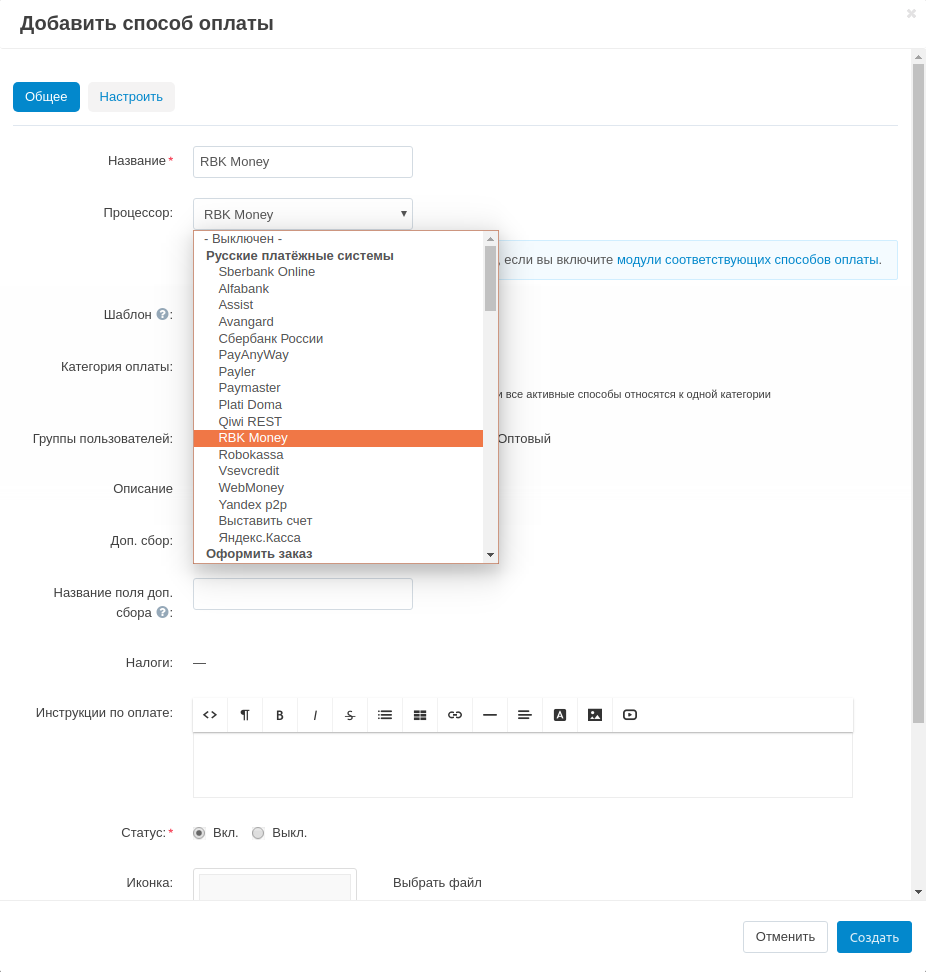 - Выберите процессор оплаты “RBK Money” в окне редактирования способа оплаты.