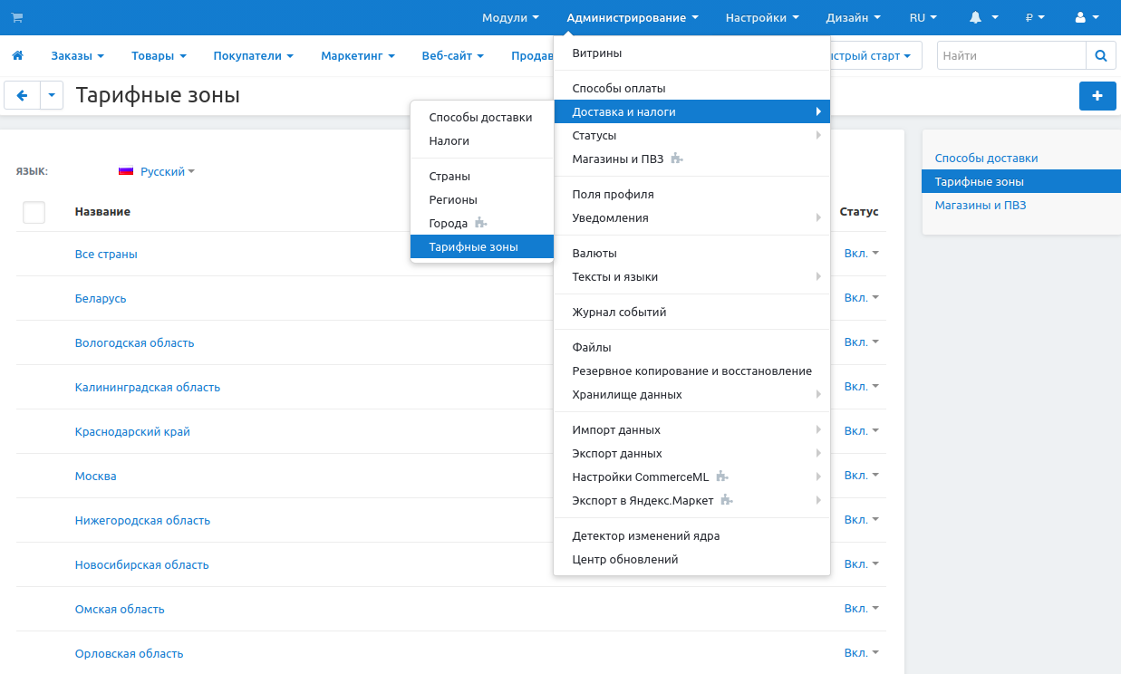 На странице Администрирование → Доставка и налоги → Тарифные зоны можно редактировать места, в которые ваш магазин осуществляет доставку. Тарифная зона — это набор параметров, которые относятся к определённой географической области.