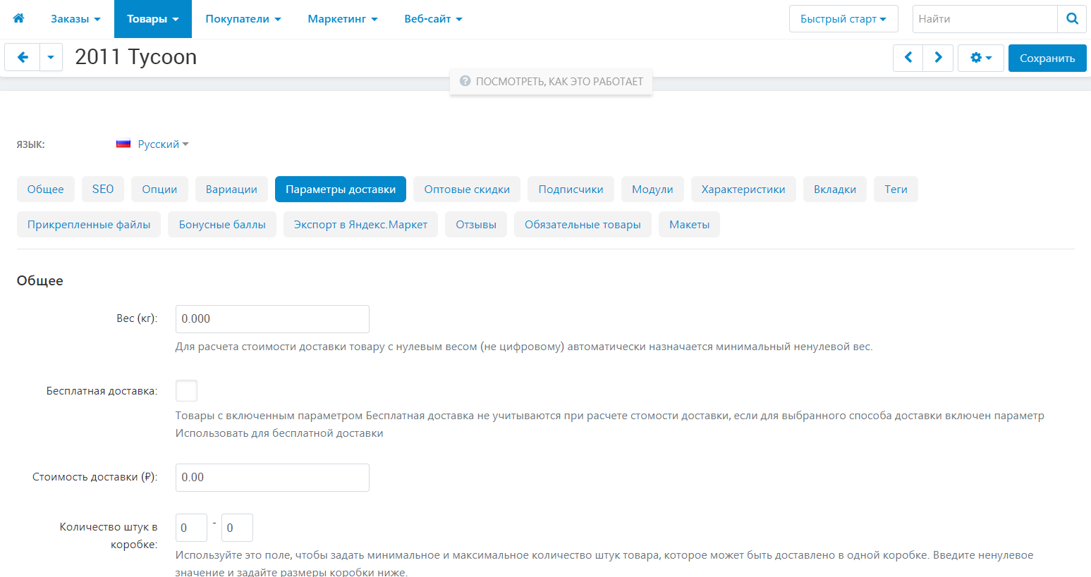 4. В поле Стоимость доставки введите сумму, которая будет взиматься за единицу товара.