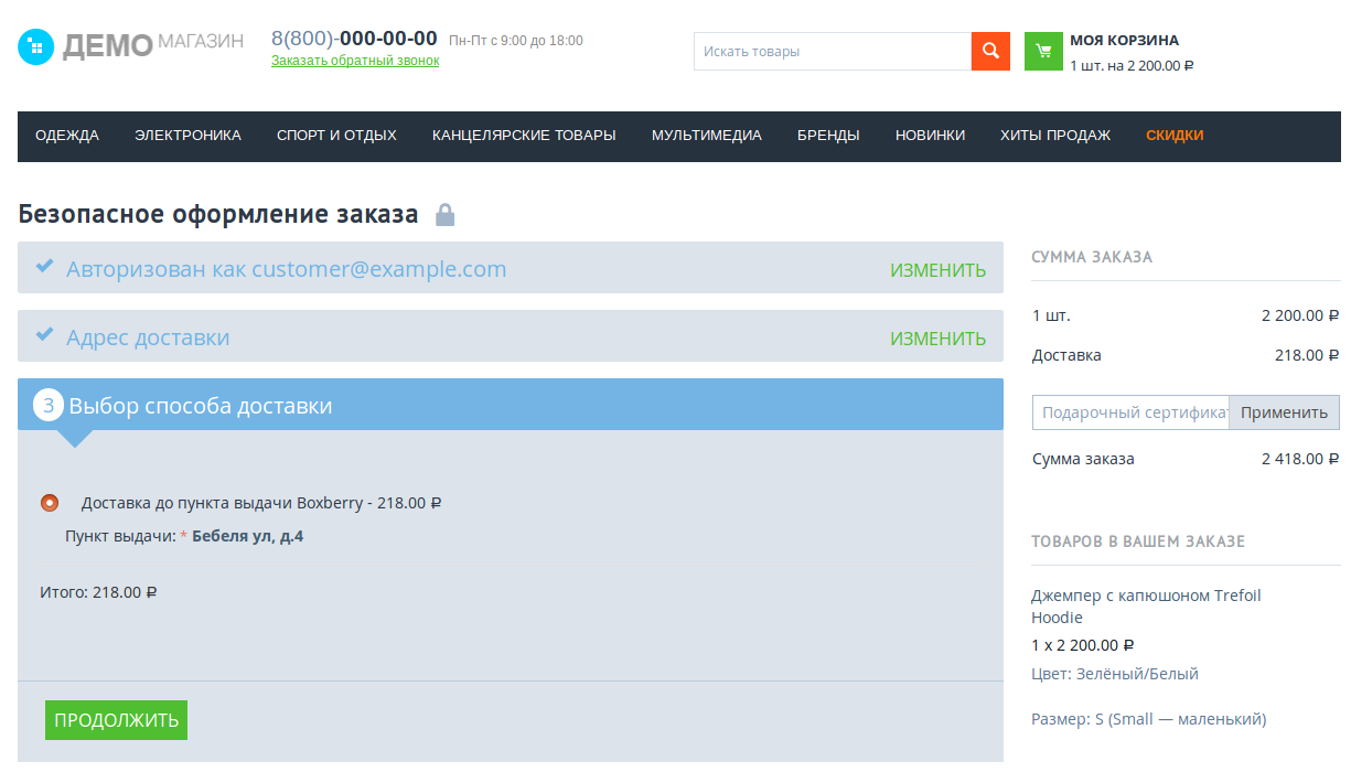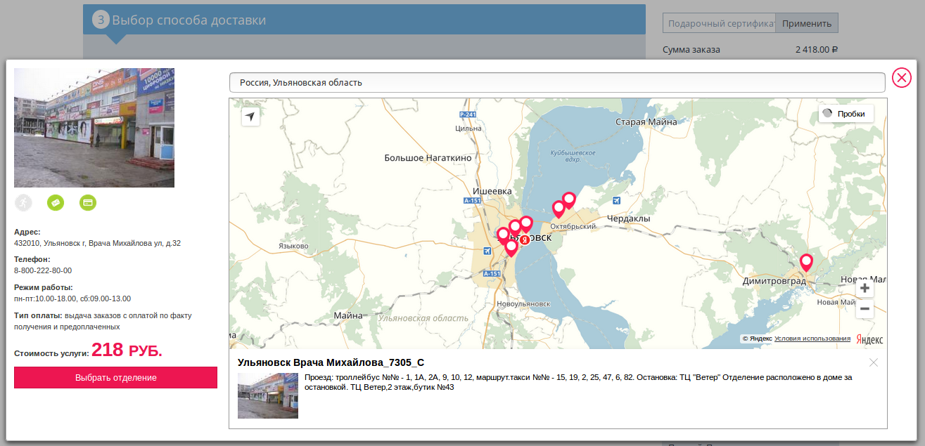 Теперь на витрине должен отображаться новый способ доставки, которым сможет воспользоваться покупатель. При нажатии на адрес пункта выдачи откроется карта во всплывающем окне, и покупатель сможет выбрать другой пункт выдачи.