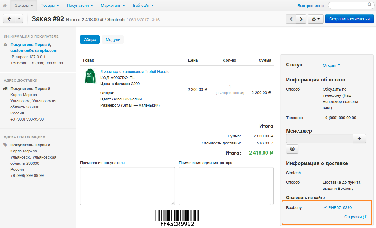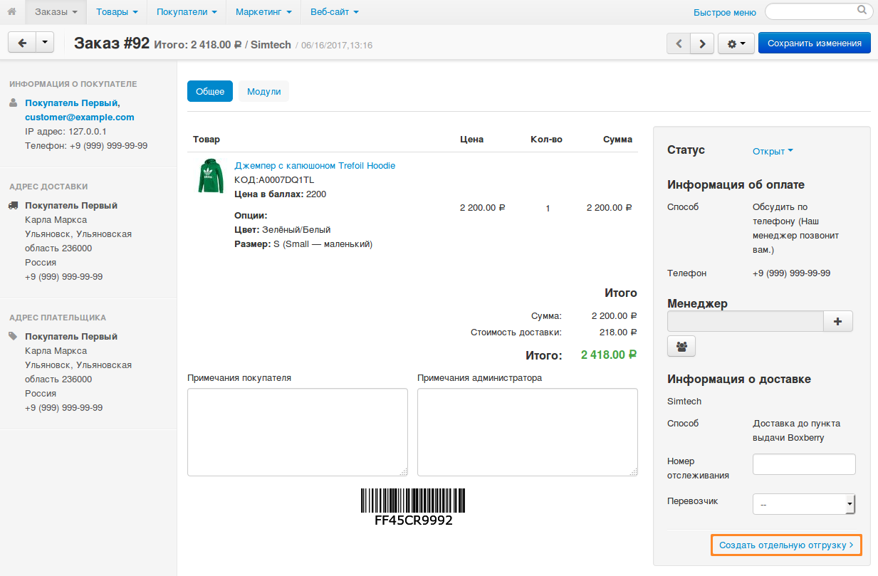 Отгрузка будет создана, а на странице заказа появится номер отслеживания.