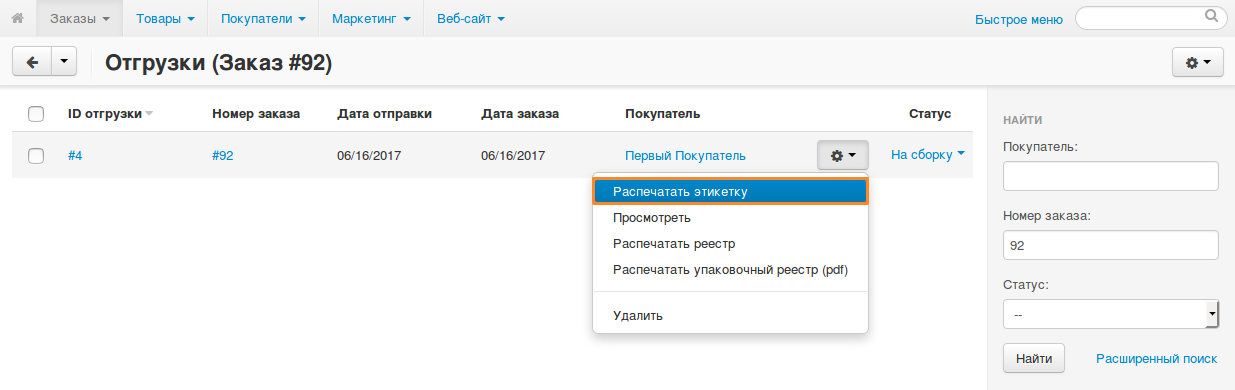 Для отгрузки можно распечатать этикетку. Для этого перейдите на список отгрузок по ссылке Отгрузки либо через меню Заказы → Отгрузки → Способы доставки. После этого нажмите на кнопку с изображением шестерёнки рядом с отгрузкой и выберите вариант Распечатать этикетку.
