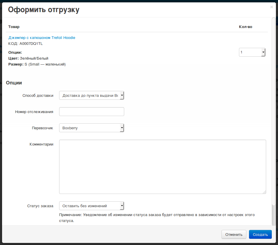 Появится всплывающее окно с информацией об отгрузке. Выберите перевозчика Boxberry и нажмите кнопку Создать.