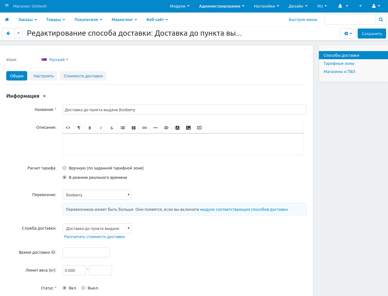 - Название — введите название способа доставки, которое покупатель увидит при оформлении заказа; например, Доставка до пункта выдачи Boxberry.