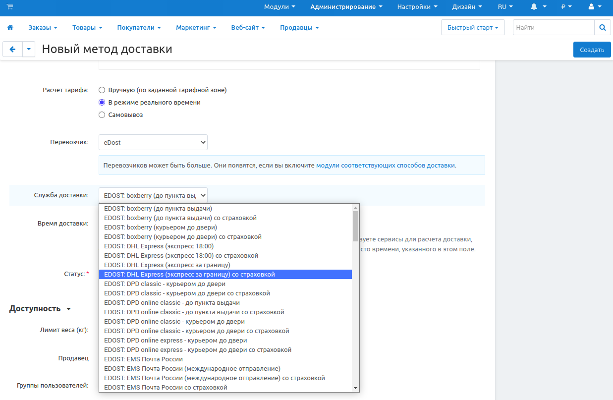 Расчет тарифа В реальном времени Служба доставки Список служб EDOST. Для каждой службы которая необходима создайте отдельный способ доставки. Другие настройки На ваше усмотрение