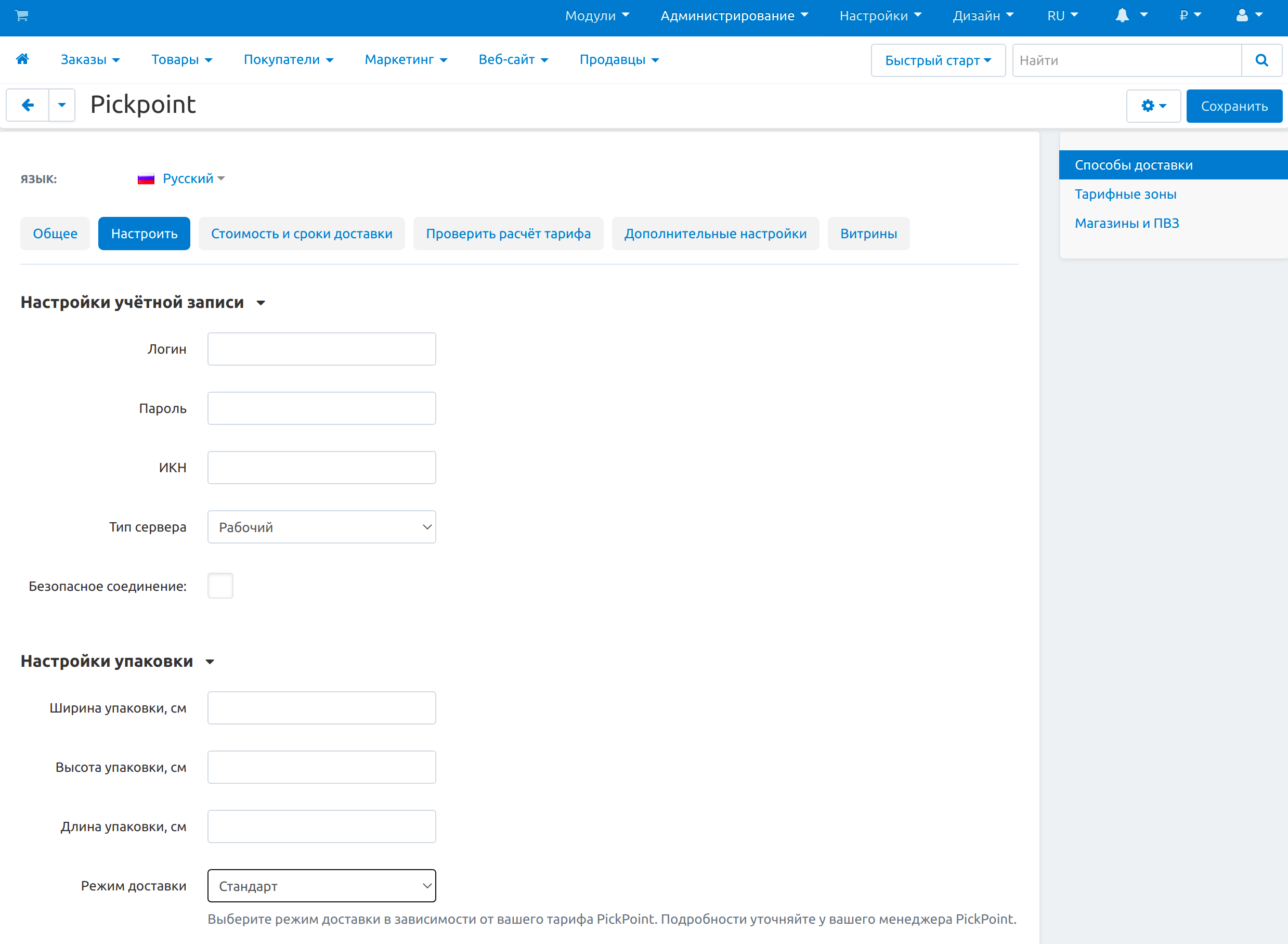 Логин Логин полученный в Pickpoint Пароль Пароль полученный в Pickpoint ИКН ИКН полученный в Pickpoint Тип сервера Тестовый или рабочий сервер, используемый для передачи данных Безопасное соединение При включении данной настройки, для передачи данных будет использоваться безопасное соединение Настройки упаковки Ширина, высота, длина упаковки в см Режим доставки Выберите режим доставки в зависимости от вашего тарифа PickPoint. Подробности уточняйте у вашего менеджера PickPoint. Примечание